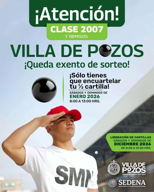 El Gobierno Municipal de Villa de Pozos a través de la Junta Municipal de Reclutamiento invita a los jóvenes del municipio que estén por cumplir o ya hayan cumplido 18 años, a que realicen el trámite de la Cartilla del Servicio Militar Nacional, documento oficial indispensable para diversos procesos personales, laborales y académicos.