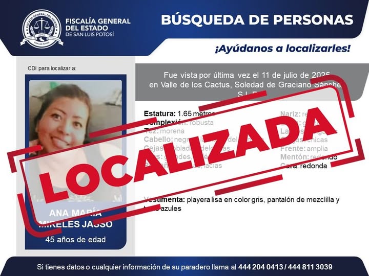 #FiscalíaSLP | La Fiscalía General del Estado informa la localización de Ana María Mireles Jasso, quien era buscada desde el 11 de julio de 2025, en Soledad de Graciano Sánchez, S.L.P.