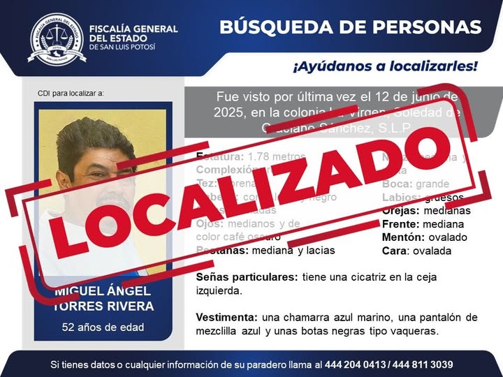 #FiscalíaSLP | La Fiscalía General del Estado informa la localización de Miguel Ángel Torres Rivera, quien era buscado desde el 12 de junio de 2025, en Soledad de Graciano Sánchez, S.L.P.